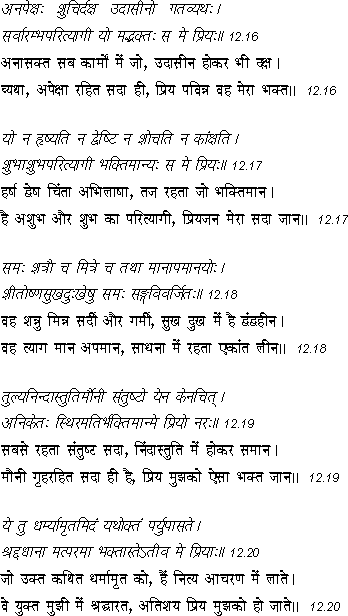 Translation of some Sanskrit shlokas from 12th chapter (Bhakti-yoga) of Gita into metered Hindi verses.