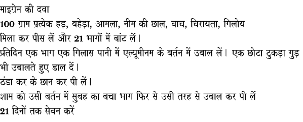 लगभग तीस साल बीत गए जब मुझे माइग्रेन का सिर दर्द होता था। महीने मैं एक दो बार तो होता ही था। जब यह होता  तो मैं अपने आप को अंधेरे कमरे में बंद कर लेता क्योंकि लाइट उस समय मैं देख नहीं पता था। बहुत तेज pulsating दर्द होता था जो कि लगभग एक दो घंटे तक रहता था। Nausea और vomiting अक्सर होती थी । फिर हमारे एक सीनियर मित्र ने एक काढ़े का नुस्खा दिया जिसका सेवन इक्कीस दिनों तक करना था।  उमको यह नुस्खा किसी फकीर ने दिया था। मैंने यह नुस्खा आजमाया। यह बहुत कामयाब सिद्ध हुआ। पहले पहल ऐसा लगता कि माइग्रेन शुरू होनेवाला है पर दर्द नहीं होता था। पूरे इक्कीस दिनो  के सेवन के बाद  माइग्रेन आना बंद हो गया।  करीब एक साल बाद एक बार फिर ऐसा लगा कि शायद माइग्रेन फिर होगा। फिर एक बार नुस्खा दोहराया। तब से अब तक फिर मुझे माइग्रेन नहीं हुआ। मेरी लड़की को एक वर्ष पहले माइग्रेन होना शुरू हुआ। उस पर भी यह नुस्खा आजमाया और यह फिर कामयाब साबित हुआ।  जिनको माइग्रेन होता है वही इसकी पीड़ा जानते हैं। मैं यह नुस्खा नीचे दे रहा हूँ।