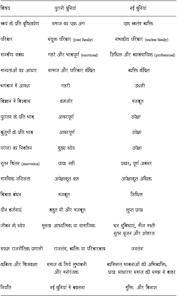 इनमें से कुछ तो जग जाहिर हैं पर कुछ का खुलासा आवश्यक है। राजनीति को ही लें। भारत एक जनतंत्र है। पर जब तक व्यक्तियों को स्वतंत्र रूप से सोचने का और व्यक्तिगत धारणाएं बनाने का मौका न मिले तब तक सच्चा जनतंत्र कायम नहीं हो सकता। भारत का जनतंत्र इसीलिये पूर्णतः कामयाब नहीं है क्योंकि यहां अधिकतर व्यक्तियों में अभी तक स्वतंत्र व्यक्तित्व का अभाव है। व्यक्तिगत बौद्धिक स्वतंत्रता के अभाव में यहां वोट बैंक‚ जातिवाद और परिवारवाद की राजनीति पनप रही है। इसी तरह पुराने के प्रति उपेक्षा का भाव नई दुनियां की धरोहर है जब कि पुरान्ी दुनियां में पुरानी परंपराओं का और वृद्धों का आदर होता है। नई दुनियां मे पुरानी परंपराओं और बड़ों की उपेक्षा अतिआवश्यक है क्योंकि इसके बिना नूतन का नव निर्माण संभव नहीं है। पुराने को तोड़ कर ही नया बनता है और पुराने का आदर करेंगे तो उसे तोड़ेंगे कैसे?