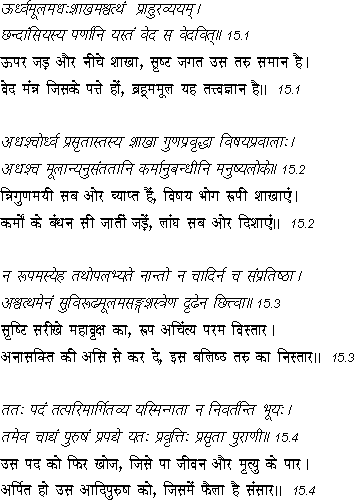 Translation of some Sanskrit shlokas from 15th chapter (Purushottam yoga) of Gita into metered Hindi verses.