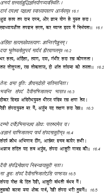 Translation of some Sanskrit shlokas from 16th chapter (Daiv-asur sampada yoga) of Gita into metered Hindi verses.