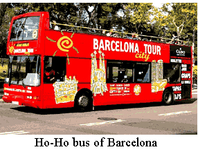 दूसरे दिन सम्मेलन में अपना कार्य समप्त होने पर हम घूमने चल दिये। आज सड़कों पर चहल पहल थी पर फिर भी बुजुर्गों की संख्या अपेक्षकृत अधिक लगी। हमने मैट्रो पकड़ी और सीधा बारसीलोना के मुख्य केंद्र “प्लाज़ा कैटलीना” पहुंच गये। वहां भीड़भाड़ थी। बारसीलोना मेंÊ जैसा कि अधिकतर योरोपीय देशों में होता है। सड़क की पटरियों पर रेस्टोरैंट वाले धूप में कुर्सी मेजें लगा देते हैं। सर्दी अच्छी खासी थी और लोग आराम से धूप में बैठ कर खा पी रहे थे। प्लाज़ा कैटलीना दो हो–हो ह्यहॉप इन हॉप आउटहृ बस लाइनों का केंद्र है। इनमें से रैड लाइन शहर के दक्षिणी हिस्से की सैर कराती है और ब्लू लाइन शहर के उत्तरी भाग की ह्यचित्र देखेंहृ। टिकट तेइस यूरो (लगभग 1600 रुपये) का मिला जिससे दिनभर हो–हो बस में बैठ कर सैर की जा सकती थी। हो–हो बसें डबल डैकर होती हैं और यात्री ऊपर की खुली छत पर बैठना पसंद करते हैं। सभी यात्रियों को एक हैडफोन मिलता है जिससे जहां घूम रहे हैं वहां की जनकारी विभिन्न भाषाओं में लगातार मिलती रहती है। हो–हो बस जगह जगह रुकती है और आप चाहें तो किसी भी स्टॉप पर उतर कर वहां के दर्शनीय स्थल देख सकते हैं और फिर अगली हो–हो बस पकड़ कर अपनी यात्रा को जारी रख सकते हैं। हो–हो बस सेवा आजकल विश्व के कई शहरों में उपलब्ध है और हाल में यह सेवा दिल्ली में भी प्रदान की गई है।
