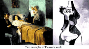 महान चित्रकार पिकासो ने बारसीलोना में कई वर्ष बिताए थे। उसके चित्रों का एक संग्रहालय भी बारस्ीलोना में है जो कि पर्यटकों में बहुत लोकप्रिय है। यह संग्रहालय बारसीलोना के प्राचीन शहर में है जहां दिल्ली के चांदनी चौक जैसी संकरी गलियां हैं।फर्क यह था कि यह गलियां साफ सुथरी थीं और भीड़भाड़ ज्यादा नहीं थी। संग्रहालय के पूर्वी भाग में पिकासो की बनाई कलाकृतियां रियलिस्टिक थीं यानि कि बिल्कुल समझ में आने वाली। एक ऐसे ही चित्र में एक शय्या पर लेटी बीमार स्त्री को दिखाया गया है ह्यचित्र देखेंहृ। फिर बाद वाले चित्र अपेक्षकृत जटिल थे और साधारण व्यक्ति की समझ से परे लगते थे। इस नवीन चित्रकला के नमूने देख कर मुझे बचपन में आकाशवाणी पर सुनी एक कविता याद हो आई जिसमें कवि एक एब्सट्रैक्ट आर्ट की नुमाइश देखने गया और फिर उसका उल्लेख किया।पूरी कविता तो मुझे याद नहीं और ना ही शायर का नाम, पर उस कविता की कुछ लाइनें इस प्रकार थीं :